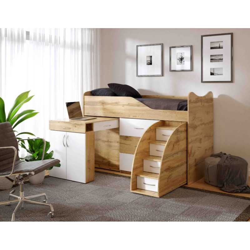 Ліжко-чердак Бедрум 5 — це сучасне та багатофункціональне рішення для дитячої або підліткової кімнати. Модель поєднує спальне місце, місткий комод, зручні сходи-гірку з висувними шухлядами та робочу зону зі столом. Така конструкція дозволяє максимально ефективно використовувати простір, забезпечуючи комфорт, порядок і безпеку. Ліжко виготовлене з якісних матеріалів, має продуману ергономіку та гармонійно вписується в сучасний інтер’єр.