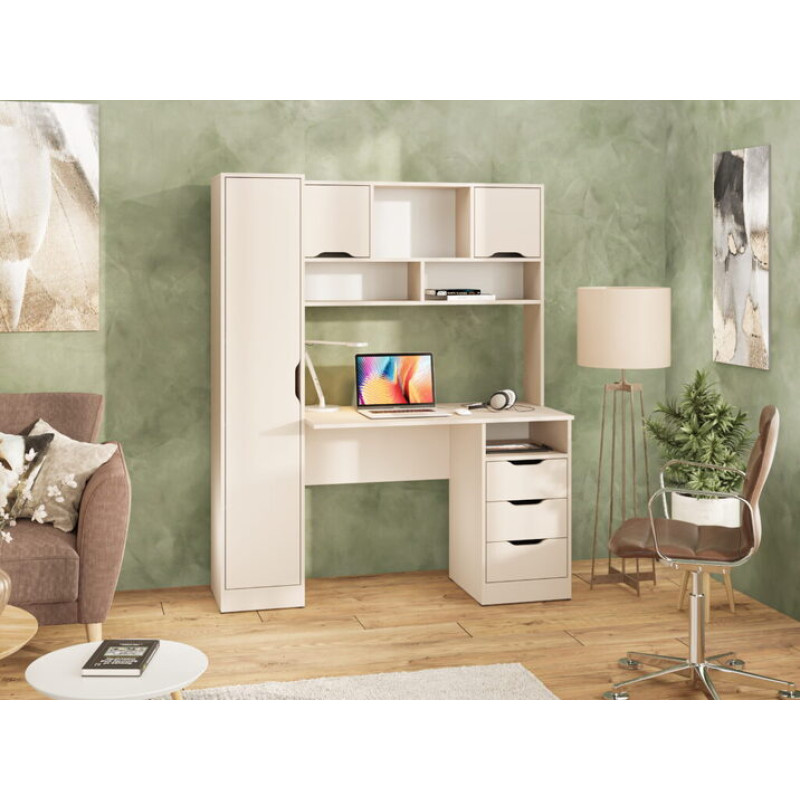 Функціонал: Поєднує письмовий стіл, високу шафу-пенал, тумбу з трьома ящиками та багаторівневу надбудову з відкритими та закритими полицями.