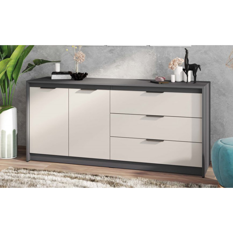 Комод К-2+3 - сучасний комод у лаконічному стилі з контрастним поєднанням теплих світлих фасадів і темного корпусу. Оснащений двома розпашними дверцятами та трьома місткими висувними шухлядами — зручно для зберігання одягу, білизни або документів. Прямі лінії, мінімалістичні ручки та стриманий дизайн роблять його універсальним рішенням для вітальні, спальні або кабінету. Практичний, акуратний і без візуального перевантаження.