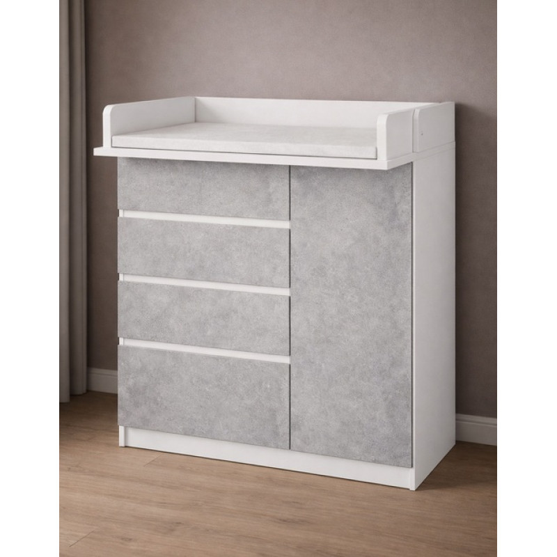 Комод виконаний у білому кольорі з фасадами відтінку «Бетон», завдяки чому гармонійно вписується в сучасні інтер’єри. Чотири просторі шухляди та додаткова менша шухляда забезпечують зручне зберігання дитячого одягу, пелюшок та аксесуарів. Надійна конструкція гарантує стійкість і безпеку під час щоденного використання.