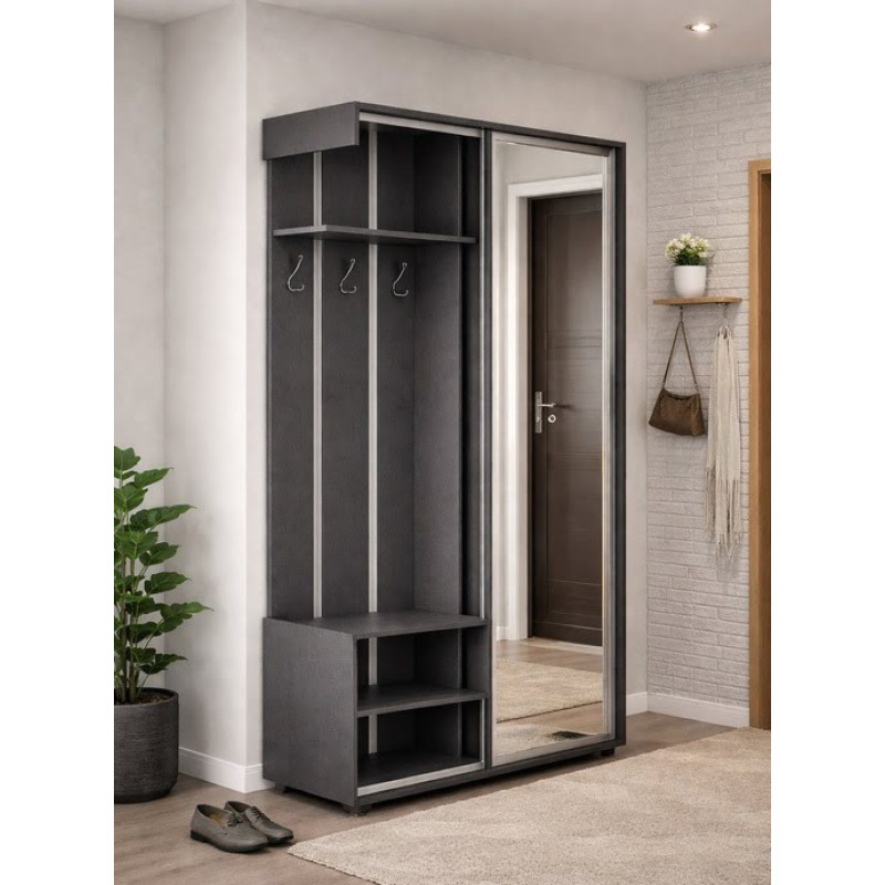 Передпокій-купе "ПР-4" від фабрики Vlabi - це компактне та функціональне рішення для невеликих приміщень. Виготовлена з екологічного ДСП (зазвичай Swisspan, товщина 16 мм), що забезпечує міцність та довговічність. Модель оснащена шафою-купе з розсувними дверима, дзеркалом, відкритими полицями для головних уборів та взуття, гачками для одягу, висувною скринькою та тумбою з дверцятами. Універсальне складання дозволяє встановити її на ліву або праву сторону. Габарити і кольори варіюються залежно від каталогу фабрики, що робить адаптованою під різні інтер'єри. Ідеально підходить для організації простору у передпокої з акцентом на практичність та стиль.