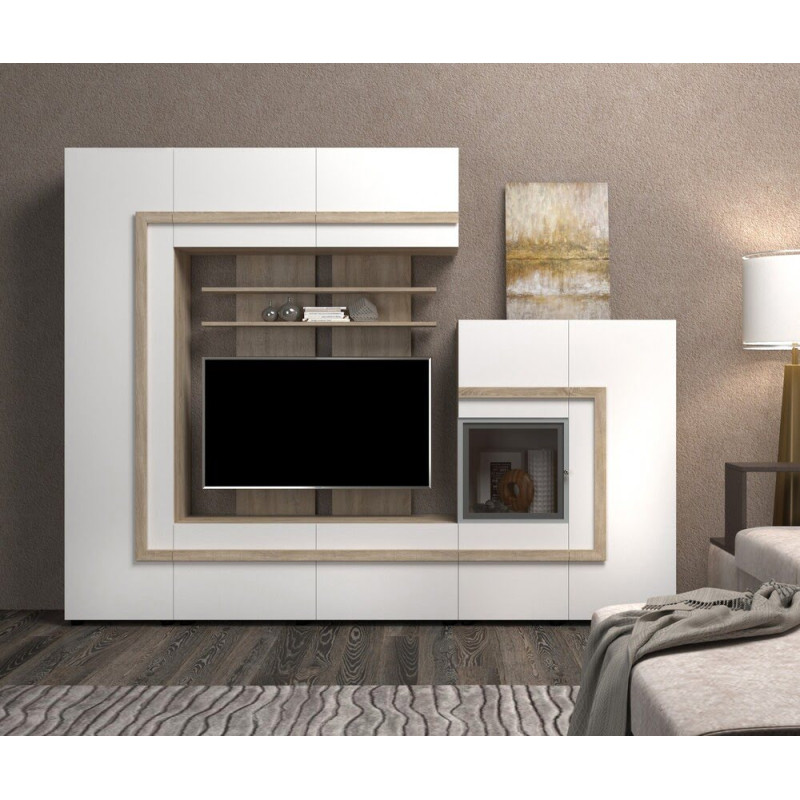 Поєднання кольорів дуб сонома та білого надає меблям легкості та сучасного вигляду, завдяки чому стінка гармонійно вписується в різні стилі інтер’єру. Конструкція включає відкриті полиці, шафи та відділення для техніки, що дозволяє зручно розмістити телевізор, книги, декор та інші речі.